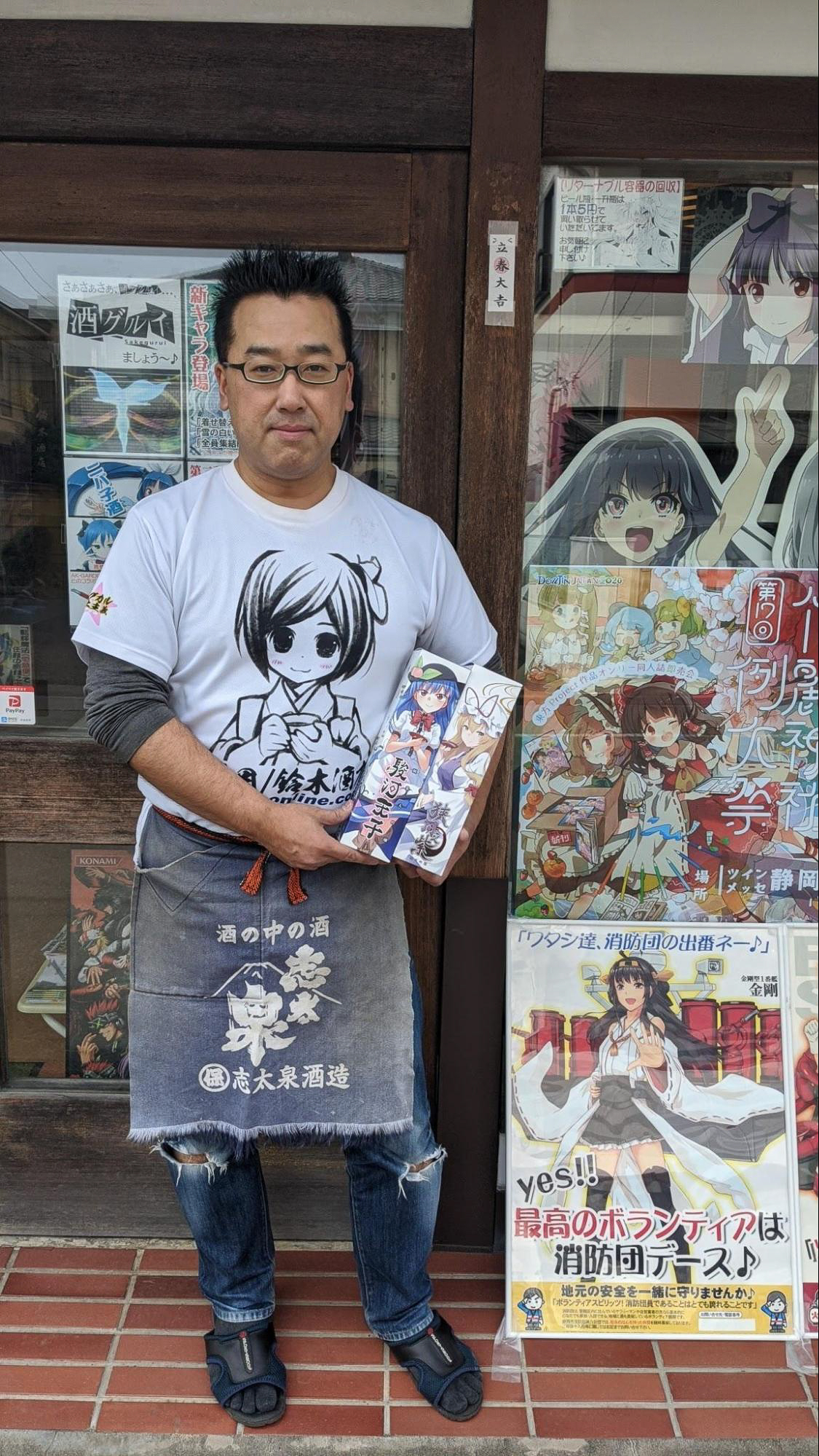 저희 가게에선 「시즈오카 모에사케 기담 静岡萌酒綺譚」이라고 해서, 오리지널 캐릭터를 이용한 사케를 팔고 있는데요. 거기에 일러스트를 그려주신「기부쵸코 ぎヴちょこ」 님께서 오랜 기간 동방의 그림들을 그려오신 분이십니다. 몇 년 전부터, 예컨대 동방홍루몽과 같은 이벤트에 출품할 수 없을까 하는 생각을 줄곧 해왔습니다. 동방과 술은 엄청나게 친밀한 관계잖아요(웃음). 하지만 그때까진 아직 동방 관련 상품이 없어서 부스를 내는 건 어려웠지요…